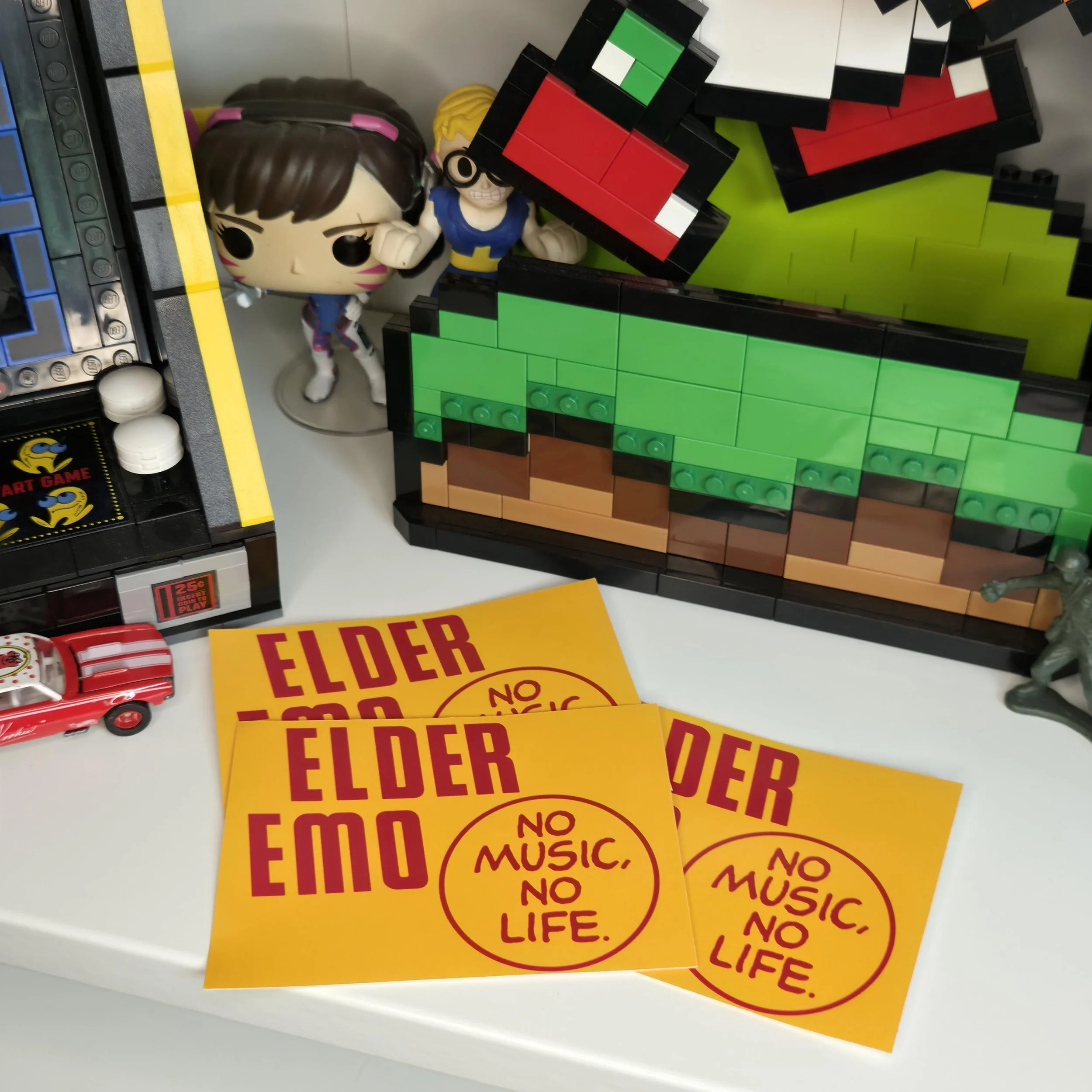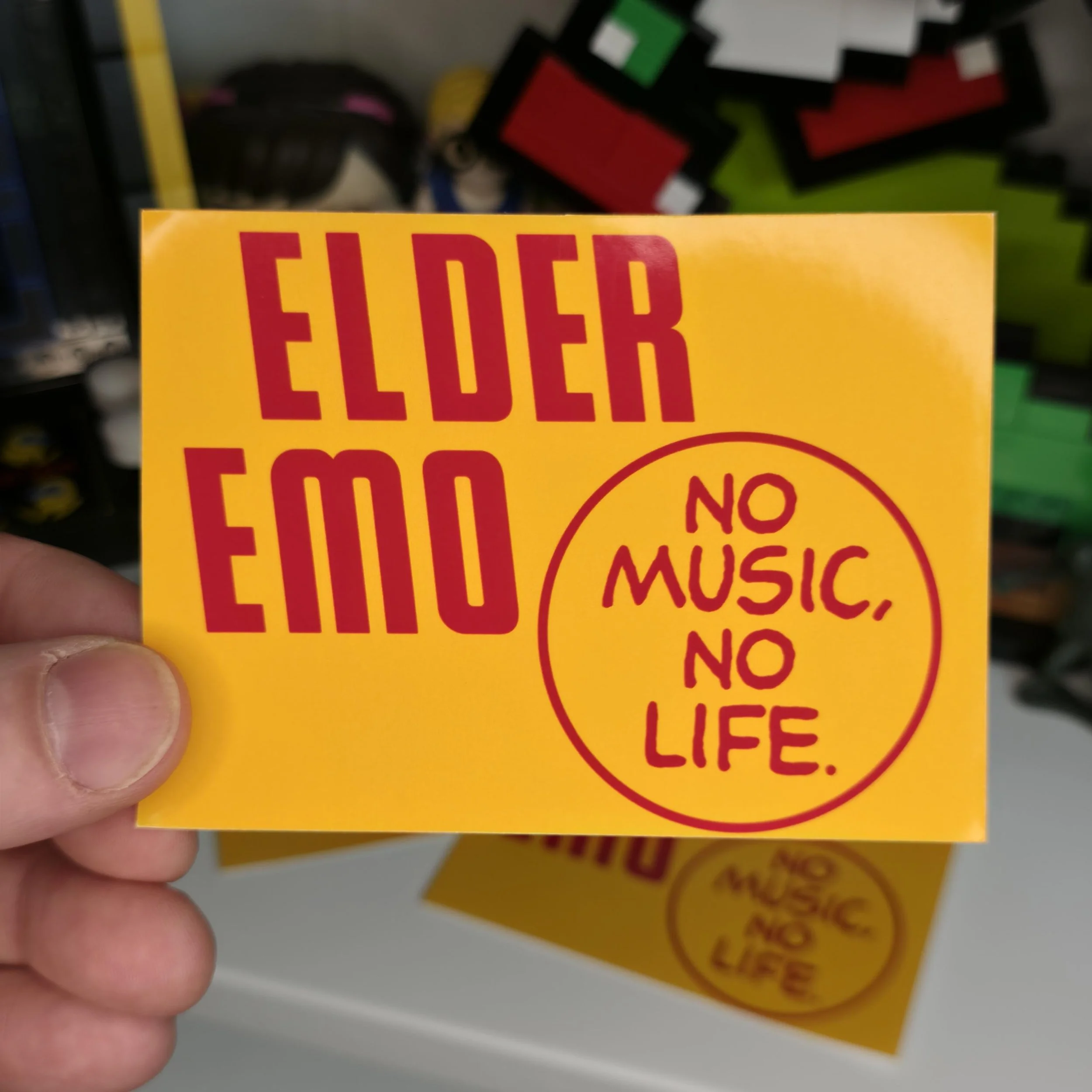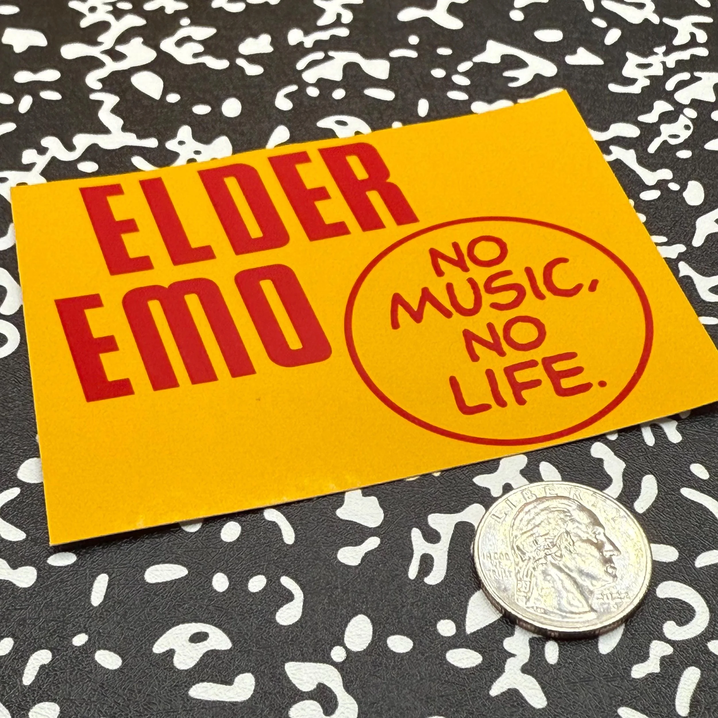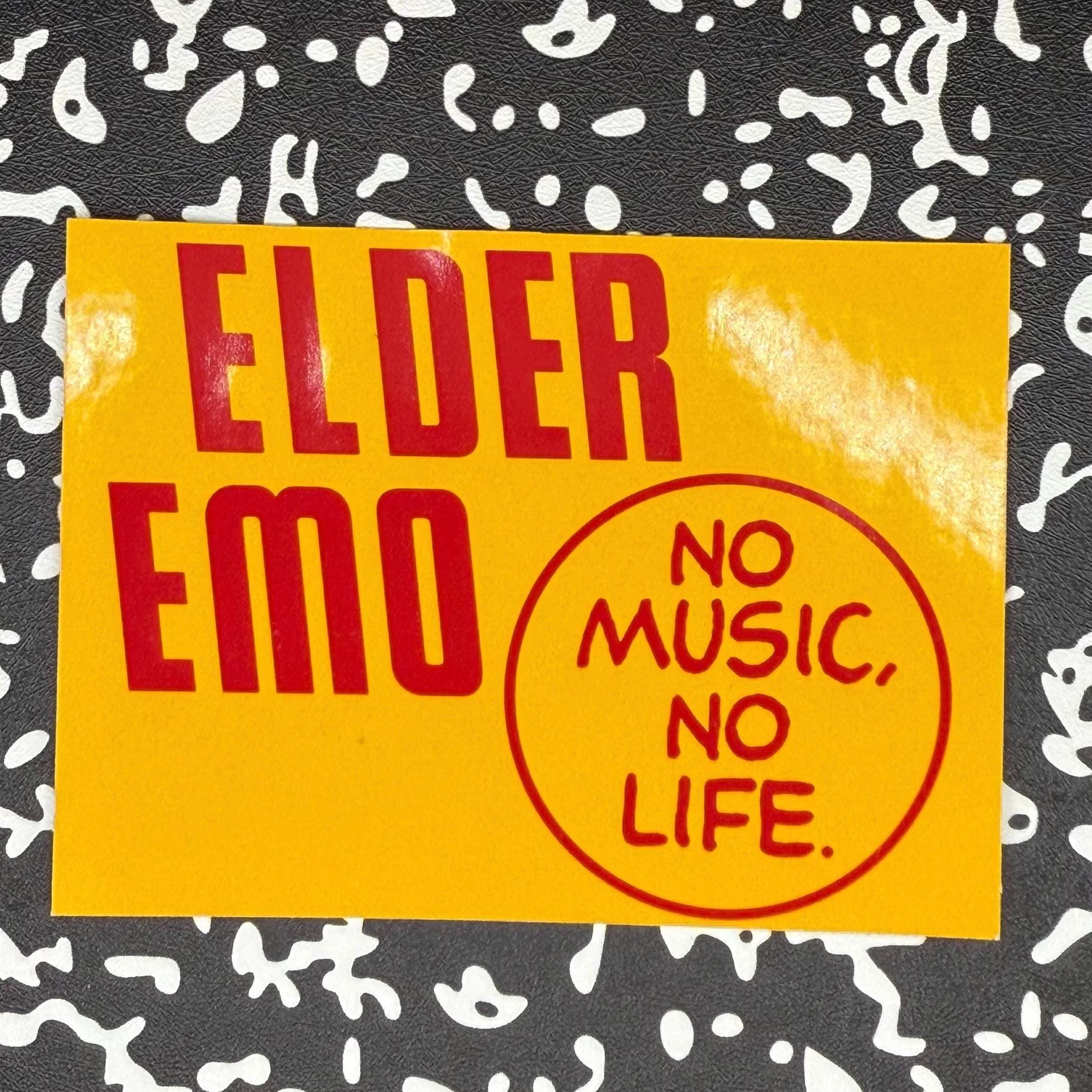 For the elder emos still living by the soundtrack. This 3-inch vinyl sticker features bold red text that reads “Elder Emo” alongside the Tower Records Slogan “No Music, No Life.”