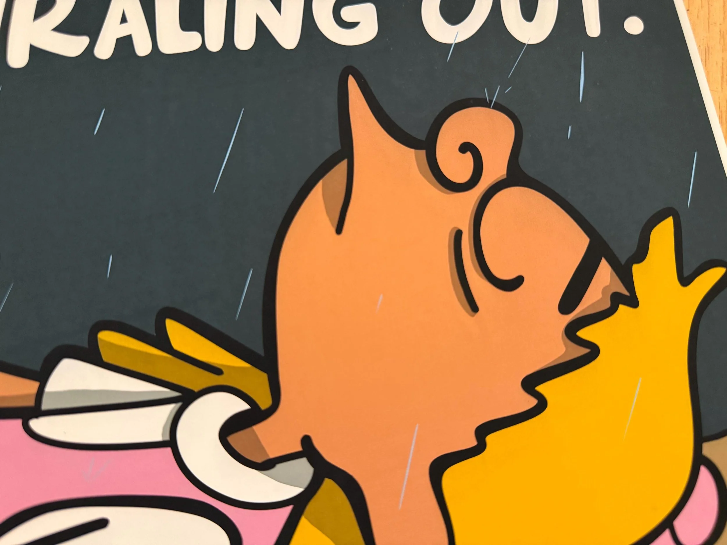 Helga Pataki, face down in the rain. Text reads: I Am Spiraling Out.
