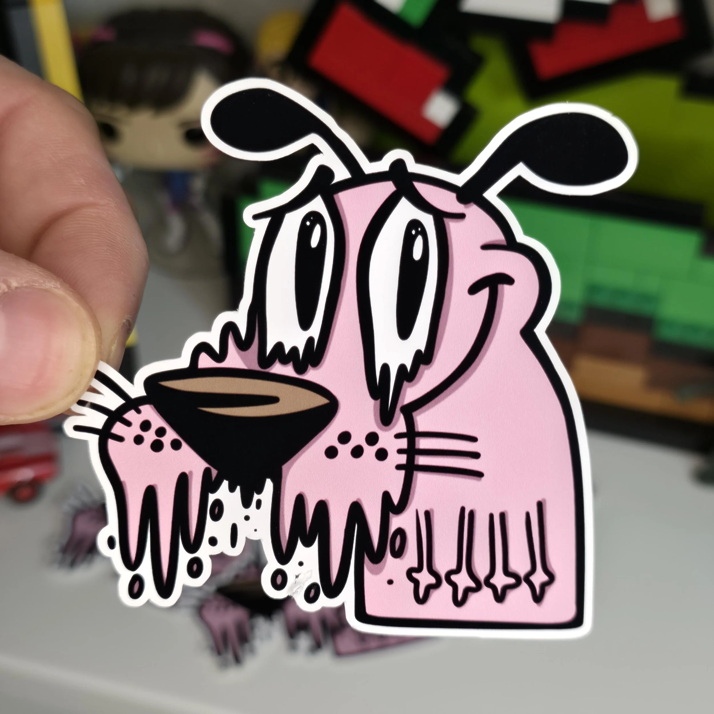 This 3-inch glossy die-cut sticker features an original, hand-drawn illustration of Courage the Cowardly Dog in a surreal, melting aesthetic. Capturing that peak feeling of overstimulation and anxiety, this design is perfect for anyone who grew up in Nowhere and still carries that "Small Sad" energy today.
