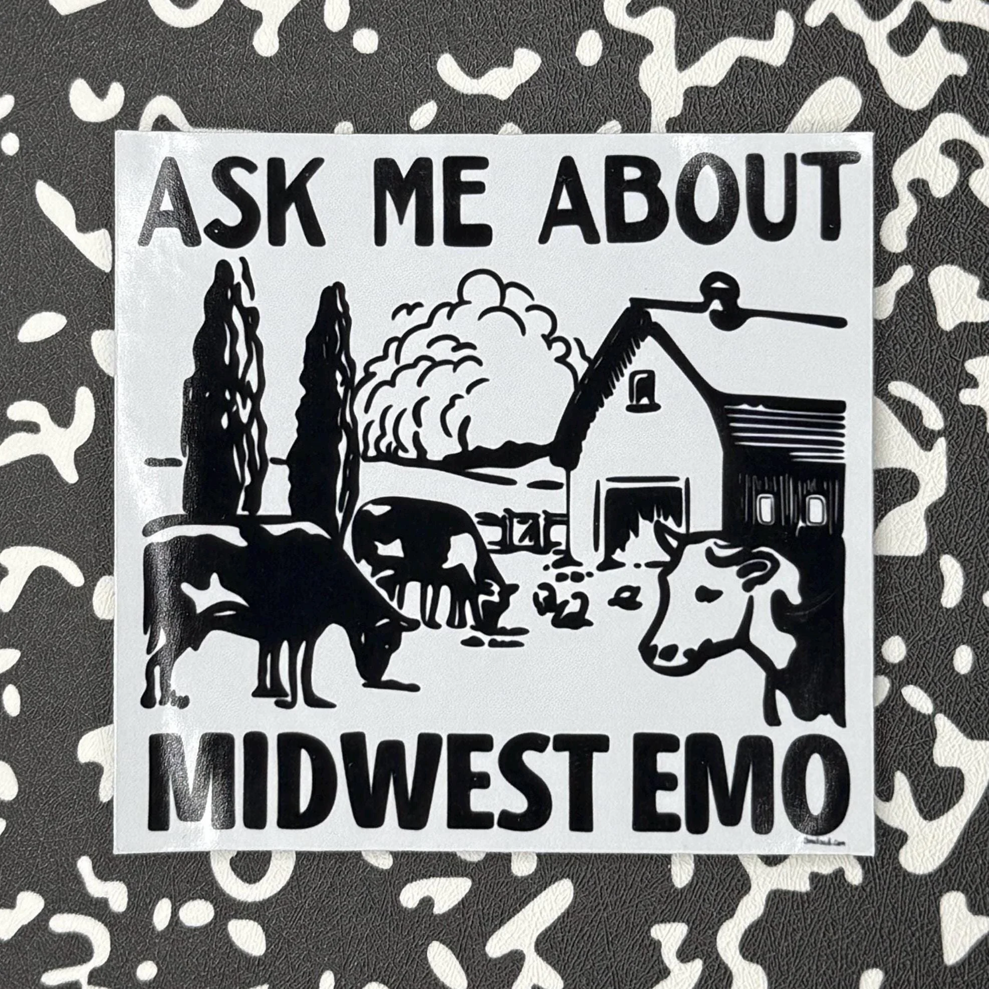 Ever feel the sudden urge to explain the difference between second-wave and third-wave emo to a total stranger? Now you don't have to wait for them to ask. This premium adhesive features a serene farm landscape—complete with cows and a barn—paired with the direct invitation to discuss everyone's favorite hyper-specific genre.