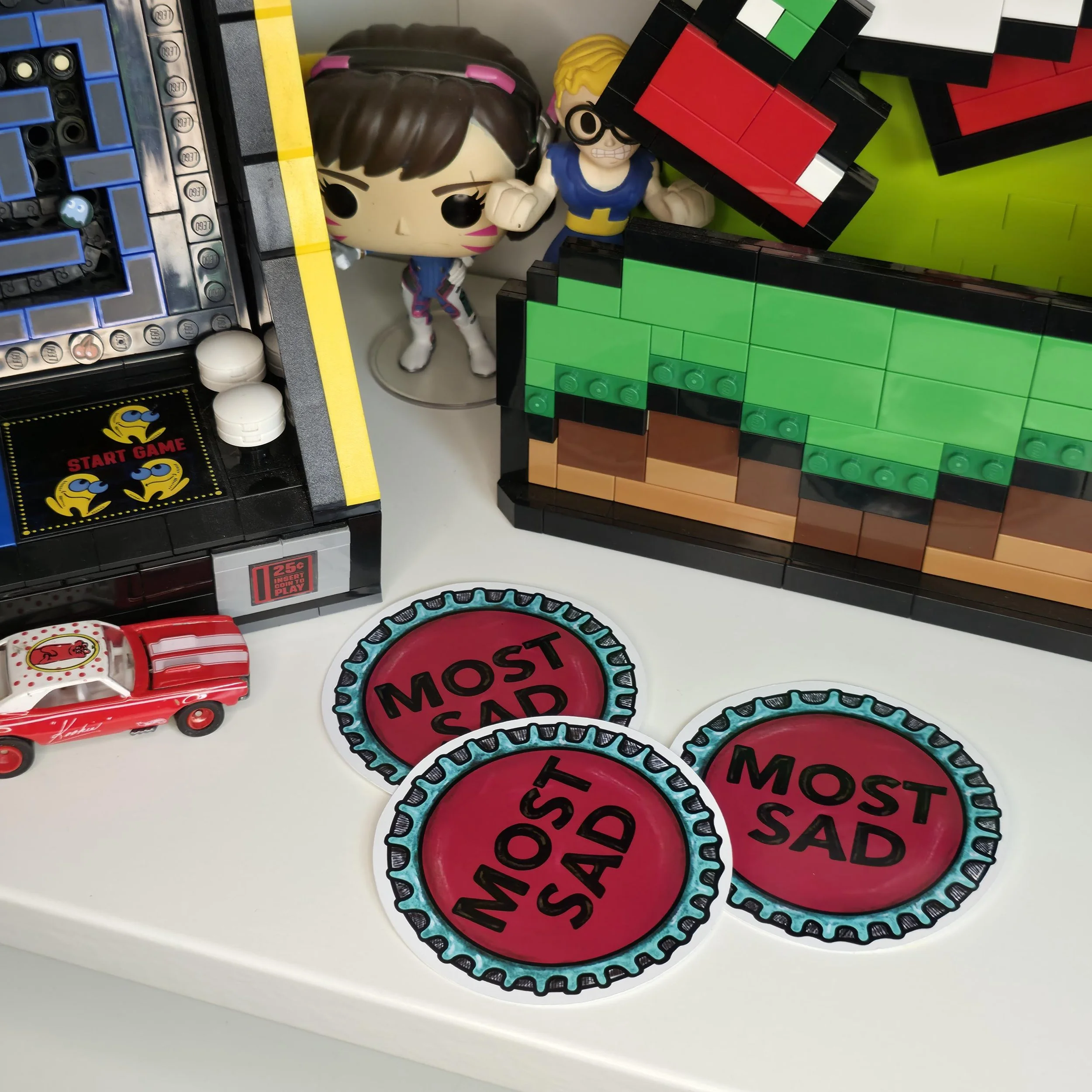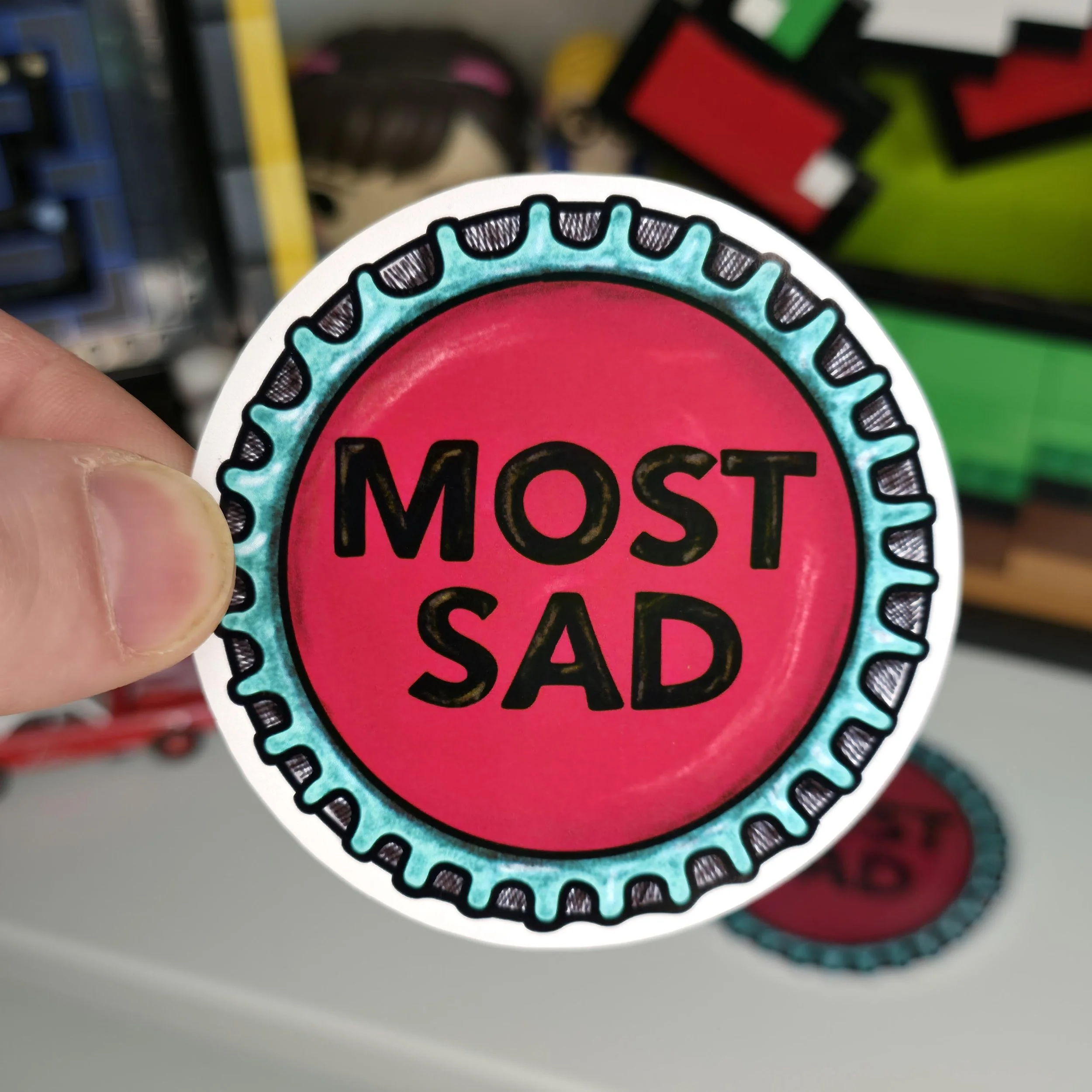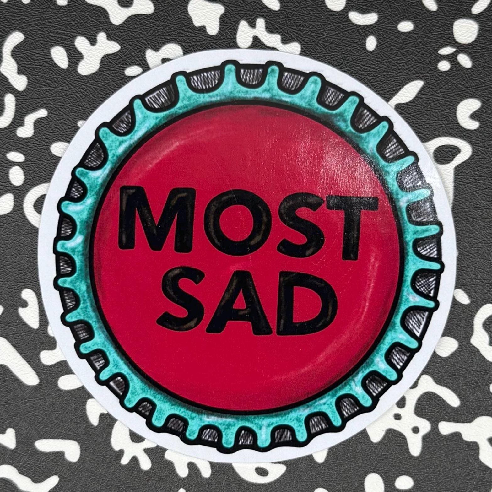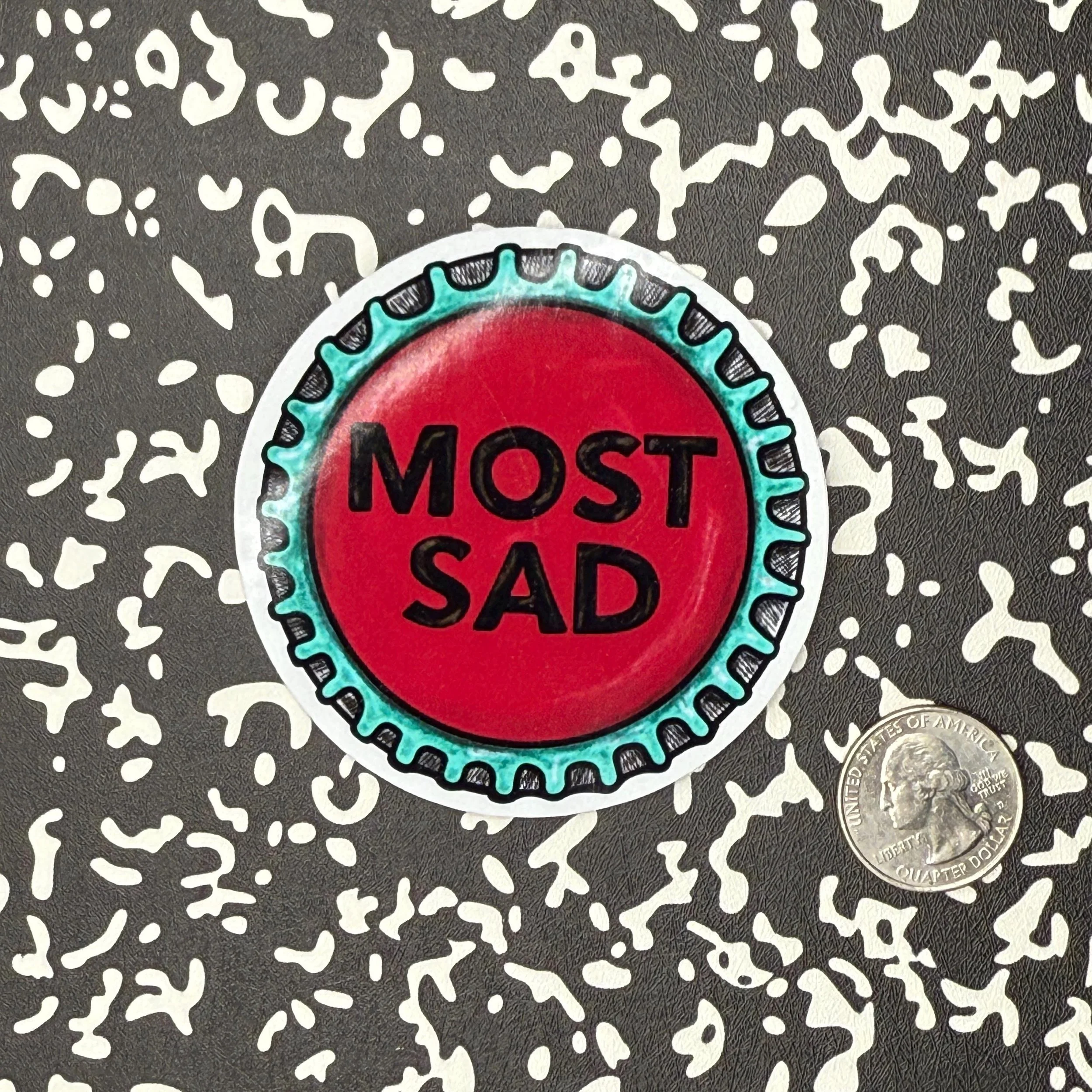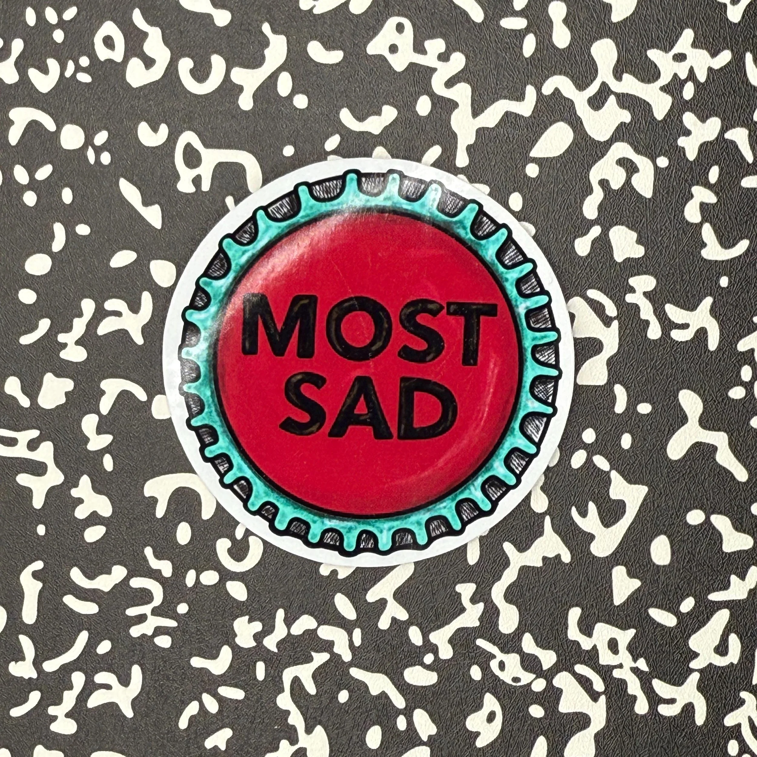 This retro bottle cap–style sticker pulls from vintage soda graphics and emo energy. Feels like something you found in a drawer in 2004 and kept forever.