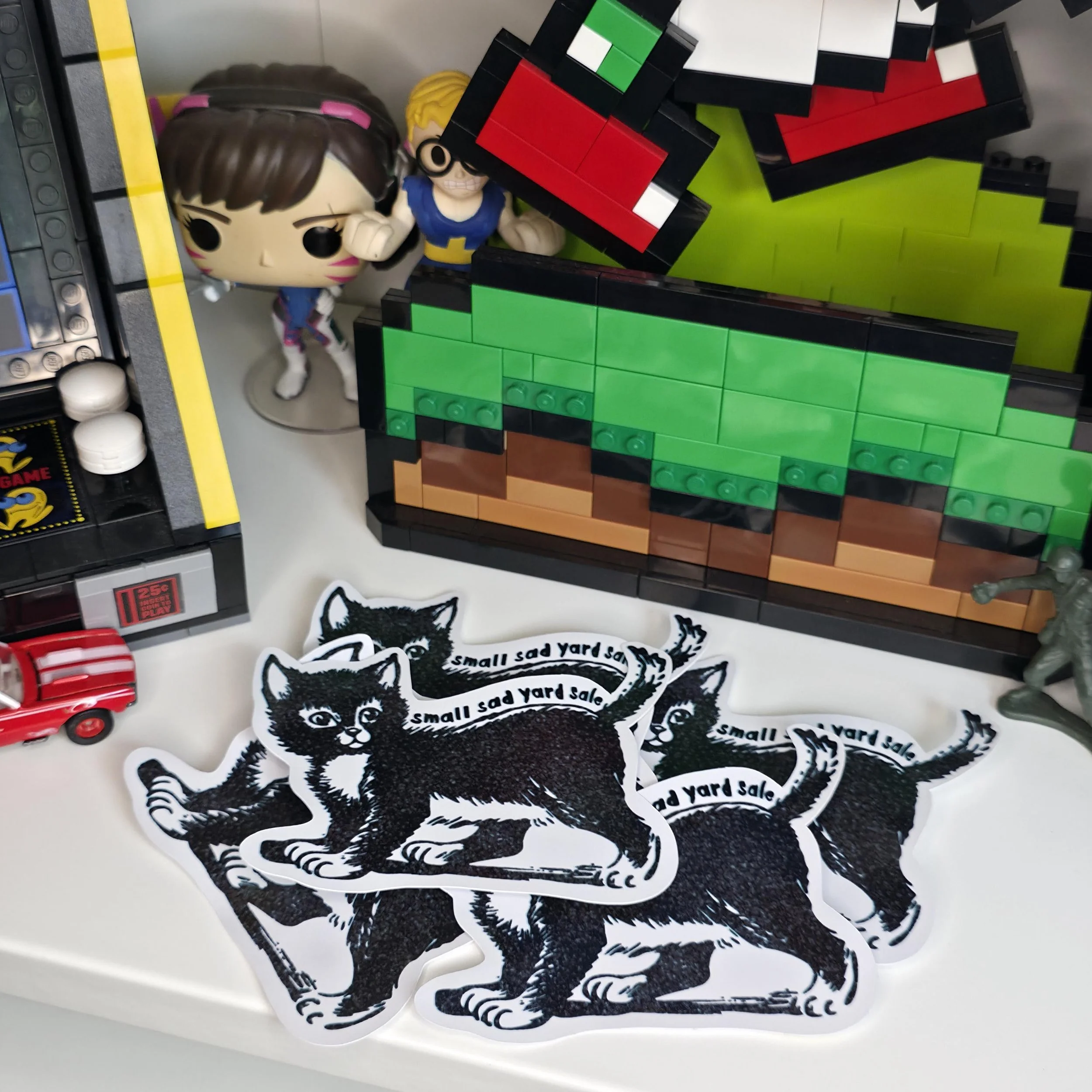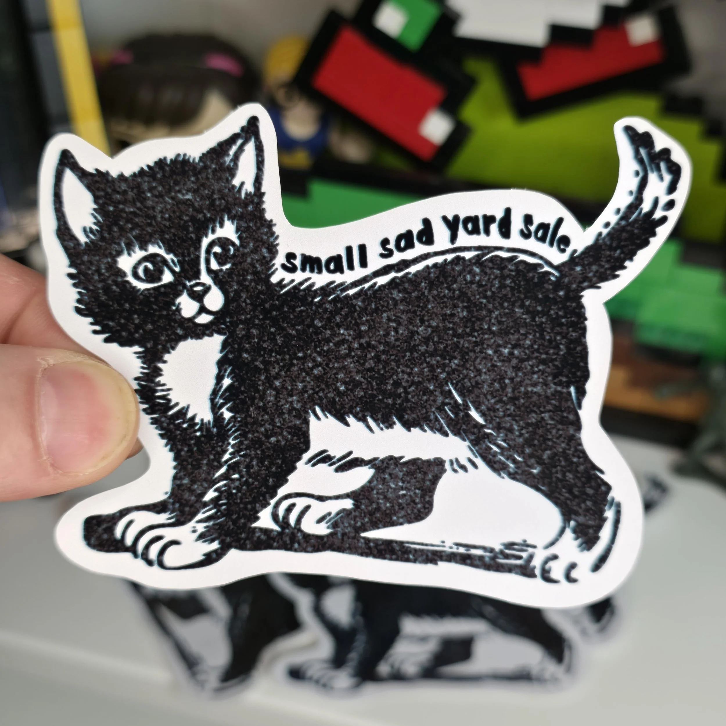 Graphic: A fuzzy black kitten with white paws and a white chest patch. Branding: Includes the "small sad yard sale" signature text arching over the cat's tail. Superior Construction: Rugged, element-proof laminate protecting against scuffs or environmental fading. Flexible Application: Excellent for skateboards, laptop lids, water bottles, or journals.