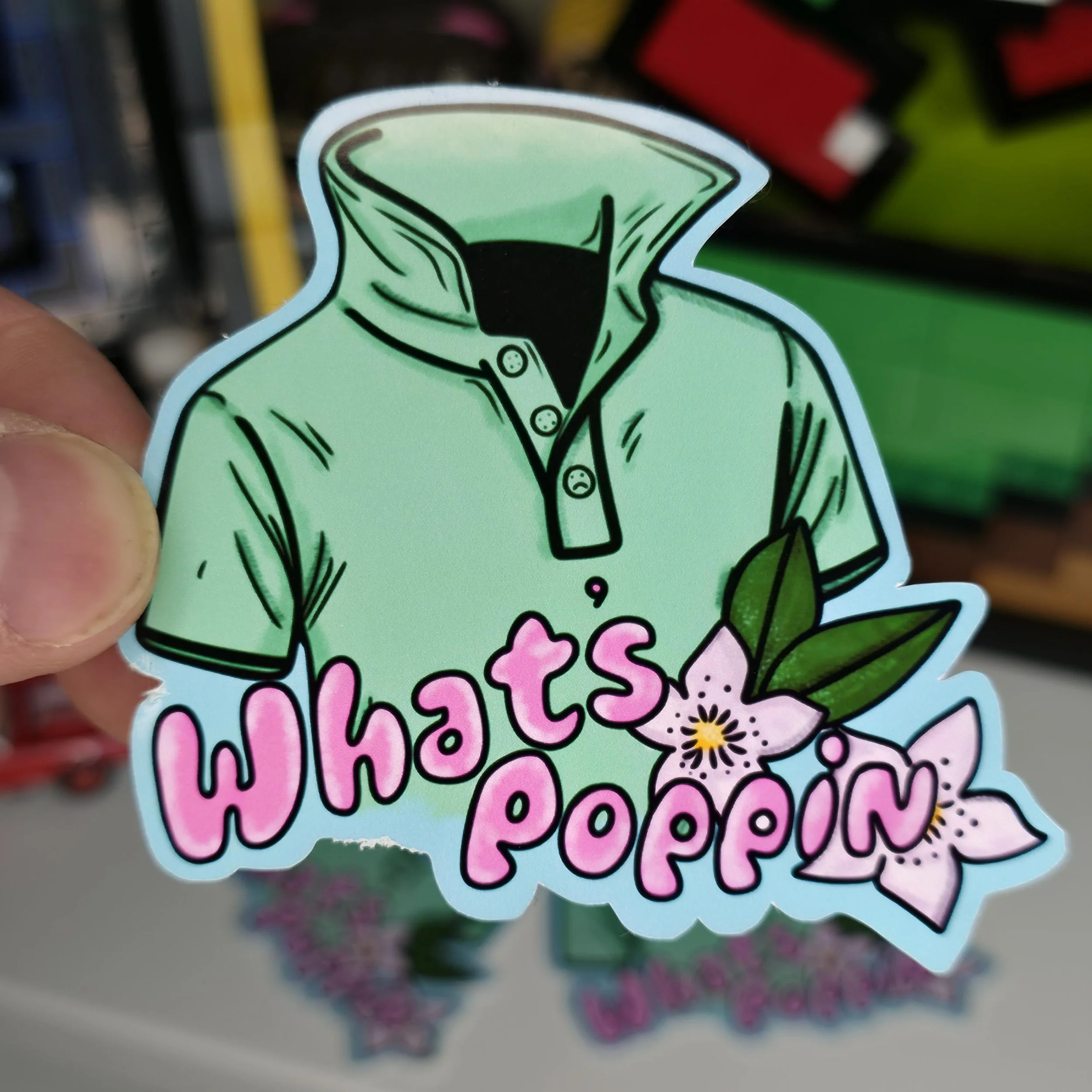 Because nothing says ironic alt humor like a popped collar. This 3-inch vinyl sticker features a mint green polo shirt with the phrase “What’s Poppin” and a flower accent.