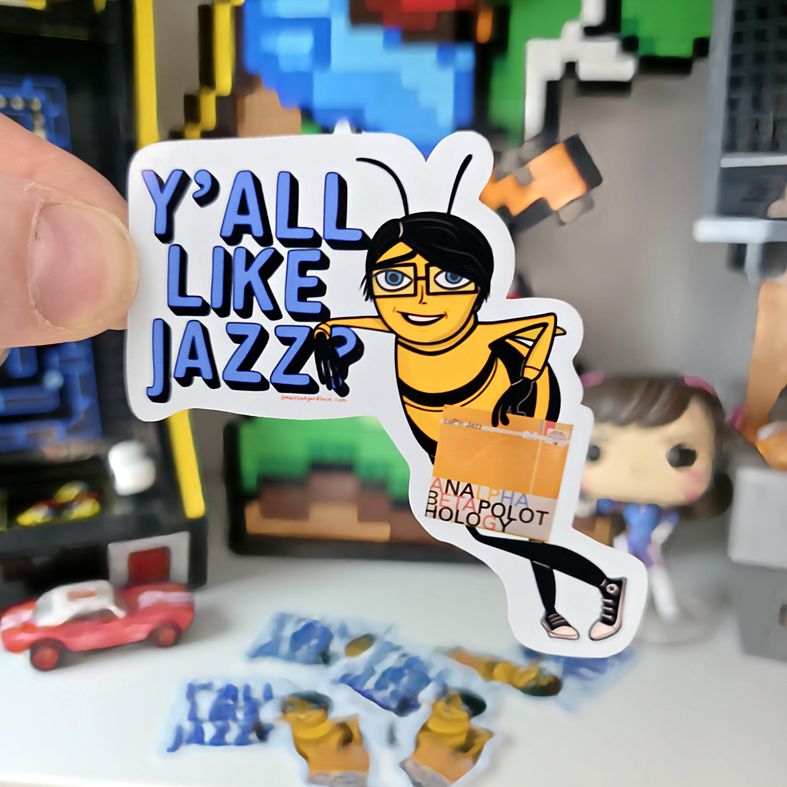 This 3-inch glossy die-cut sticker features a hand-drawn mashup of Barry B. Benson from the Bee Movie holding the iconic Cap’n Jazz Analphabetapolothology anthology. With the classic line "Y'all Like Jazz?" and some very specific scene-appropriate hair, this sticker is a tribute to the chaotic energy of Tim Kinsella and the origins of midwest emo.